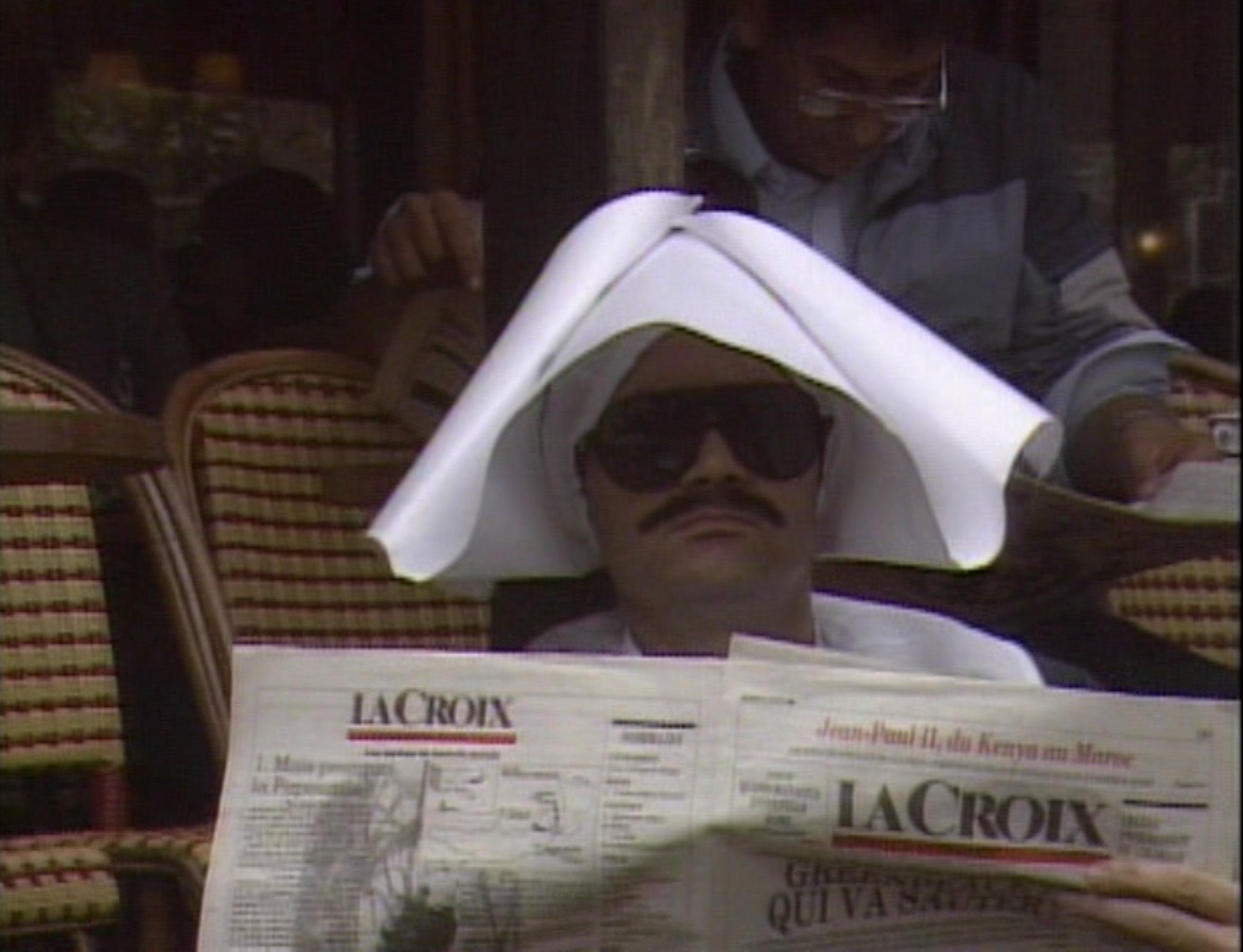 Thanks to Charles Mayer’s Fancy Robot posts, we know that all the filming in Paris took place during the summer of 1985. It’s fun to look for such things as movie placards and magazines incidentally caught on film that definitively date the shot. Here we see the mysterious man-in-black (Jean-Claude Cotillard) in Leçon 40. He’s at a table at Fouquet’s near the one at which Mireille, Robert, Hubert and Jean-Pierre are sitting. Just earlier he had appeared to be a spy who alternately blinked his eyes so as to spell «zut» in Morse code. Now, as Prof. Capretz says: «Le drôle de type qui faisait du morse en clignant ses yeux a disparu et a été remplacé par une bonne soeur qui fait du morse avec sa cornette