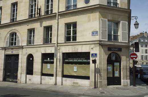 To the west, the Odéon is bordered by rue Rotrou and the next building along rue Vaugirard bears the number 20. This is the Librarie du Sénat. Le Sénat itself is now nearly directly to our south (our left as we walk down rue de Vaugirard).