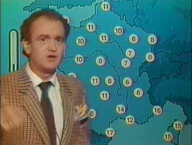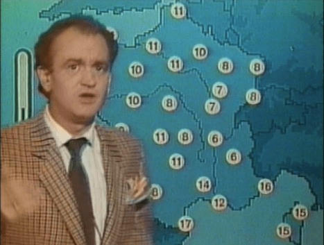 Hey FIA fans, after watching Leçon 32 for the umpteenth time, I note this detail that ought really to be added to the FIA Fans Wiki entry for this episode. (Anyone care to help resurrect the wiki?) At the beginning of the teleplay, Robert, perdu comme toujours, gets directions to the Belleau household from a guy on the street who a short time later is seen presenting the weather on the Belleau’s television. It was clear that this was the cameo of someone well known, at least to the French. There is no credit at the end, but I listened to Professor Capretz say the man’s name during his review of the dialogue and got it close enough to Google it. (Of course I could have just looked at the text of the dialogue.) He is Alain Gillot-Pétré and he was France’s most famous TV weatherman at the time and apparently much beloved. Unfortunately he died in 1999 when he was just short of 50 years old.There is information on Gillot-Pétré here and here. But something bizarre about the weather forecast we see him giving on TV: the temperatures reported from French cities are all between 7 and 11 degrees Celsius (except for Perpignan at a balmy 17). This is 45-52 degrees Farenheit, hardly temperatures typical for summertime, the season it is supposed to be in the episode.